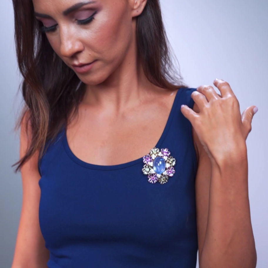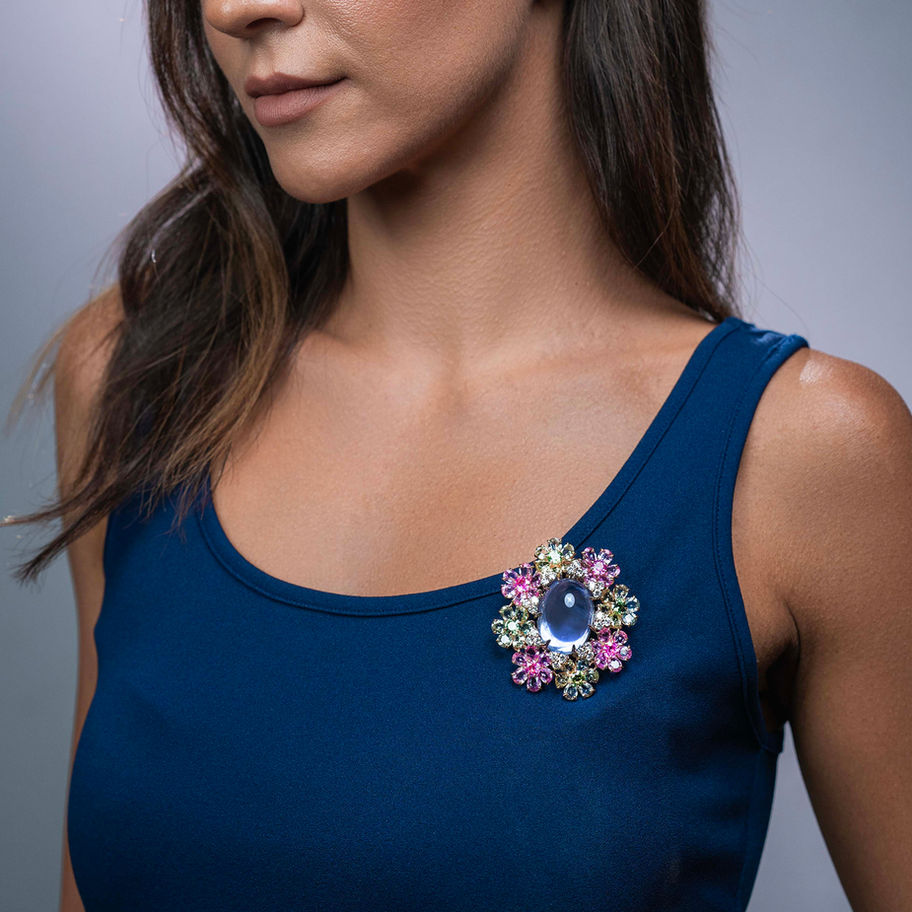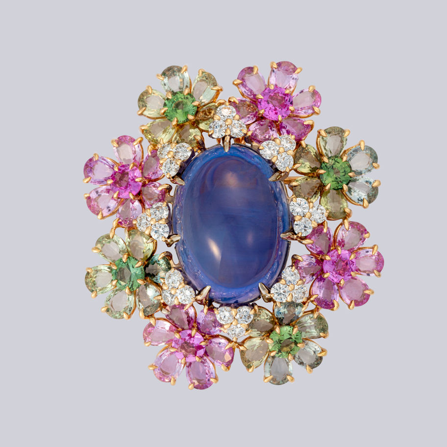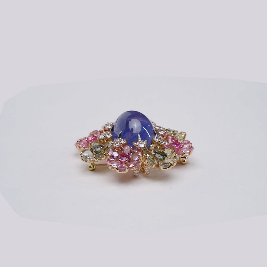 At the heart of this enchanting brooch lies a giant blue cabochon sapphire, reminiscent of a tranquil pond amidst a lush garden. Surrounding this serene centerpiece are meticulously set mixed sapphires, forming a vibrant array of blossoms that emulate the charm of a flourishing garden.